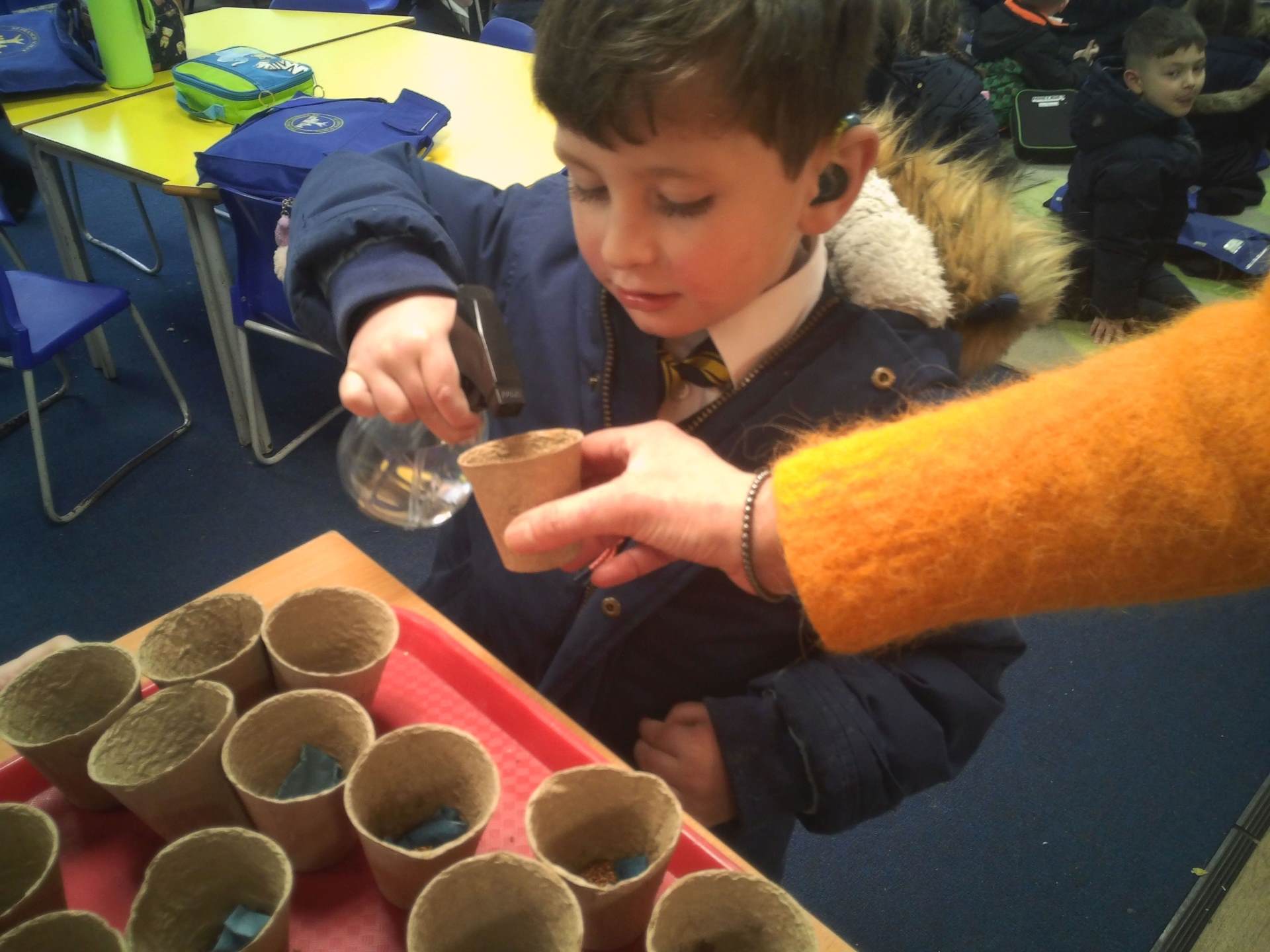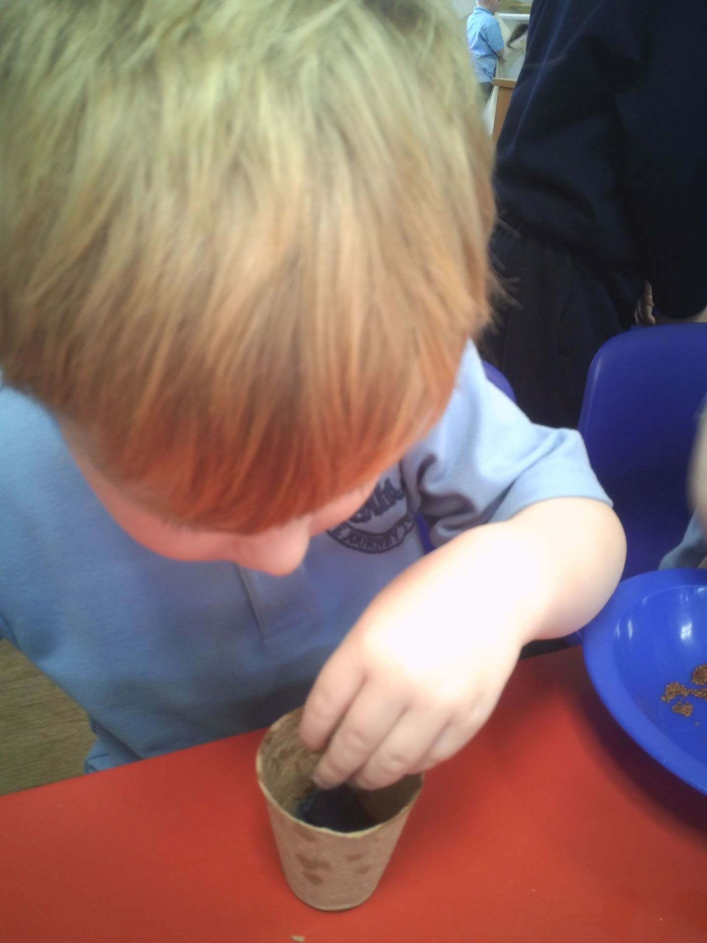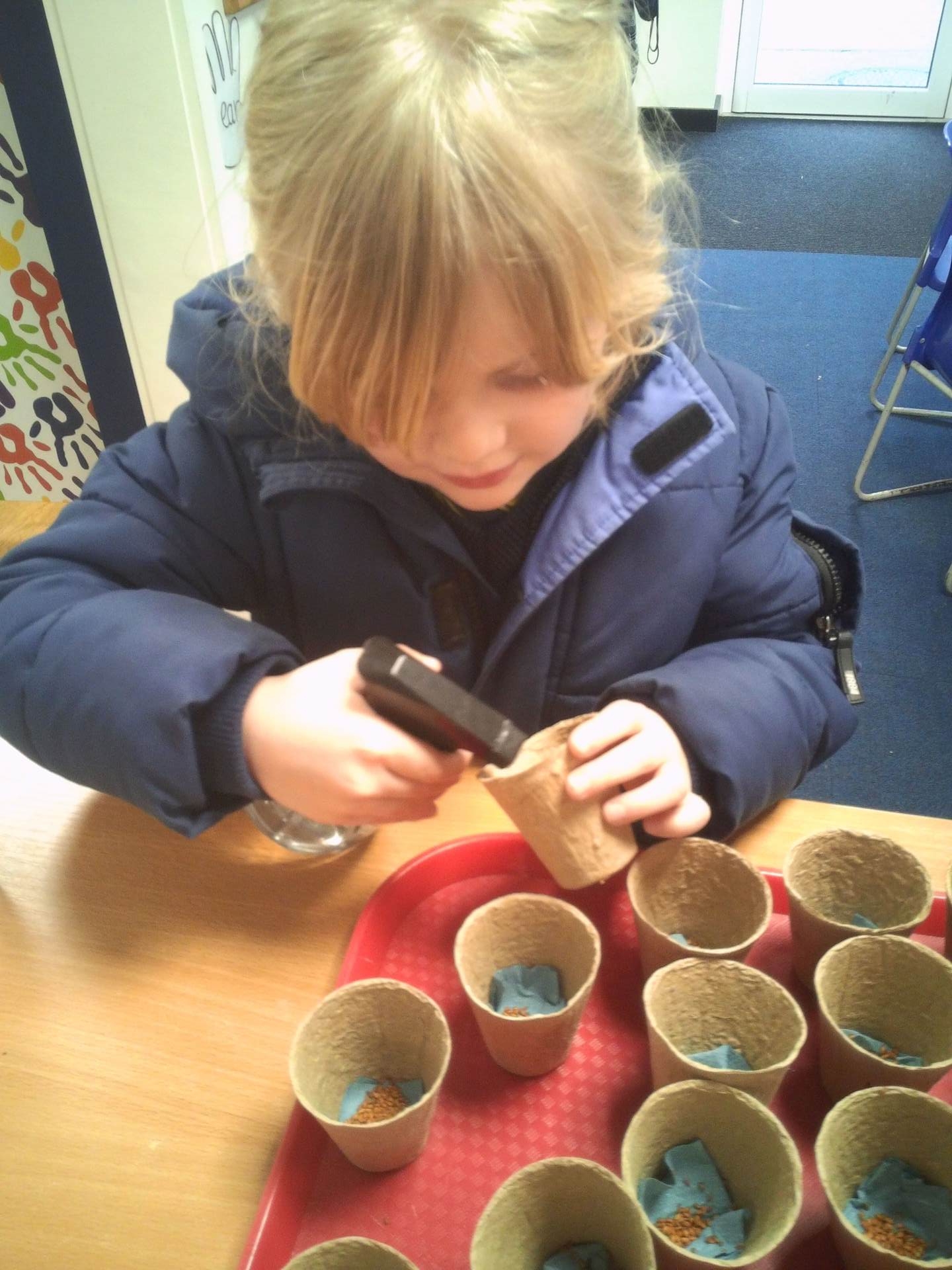 In Reception we have been learning how plants grow. We decided that the best way to see how plants grow was to grow some ourselves! Each child planted their own cress seeds, and we are waiting to see how long it takes them to grow.