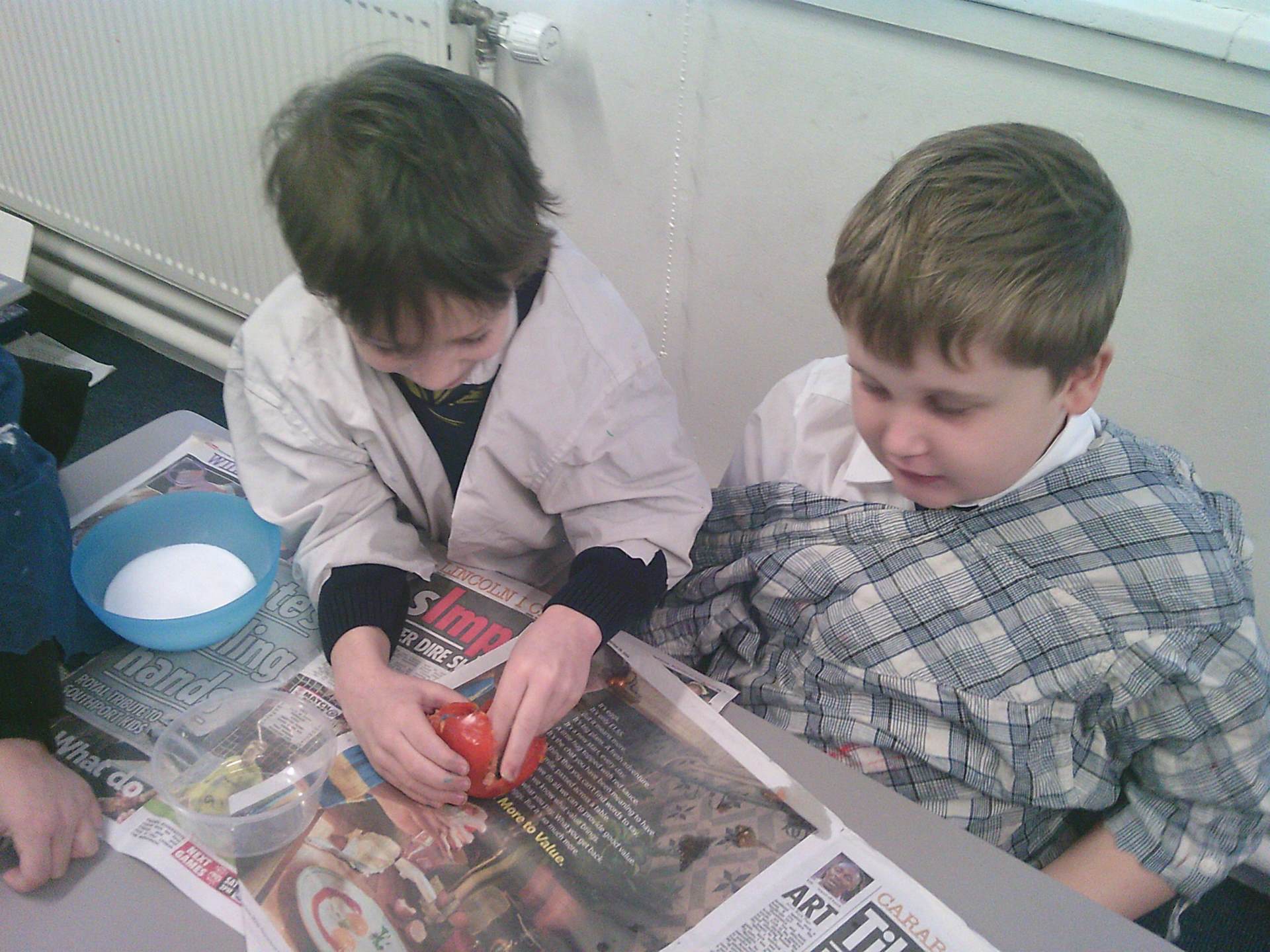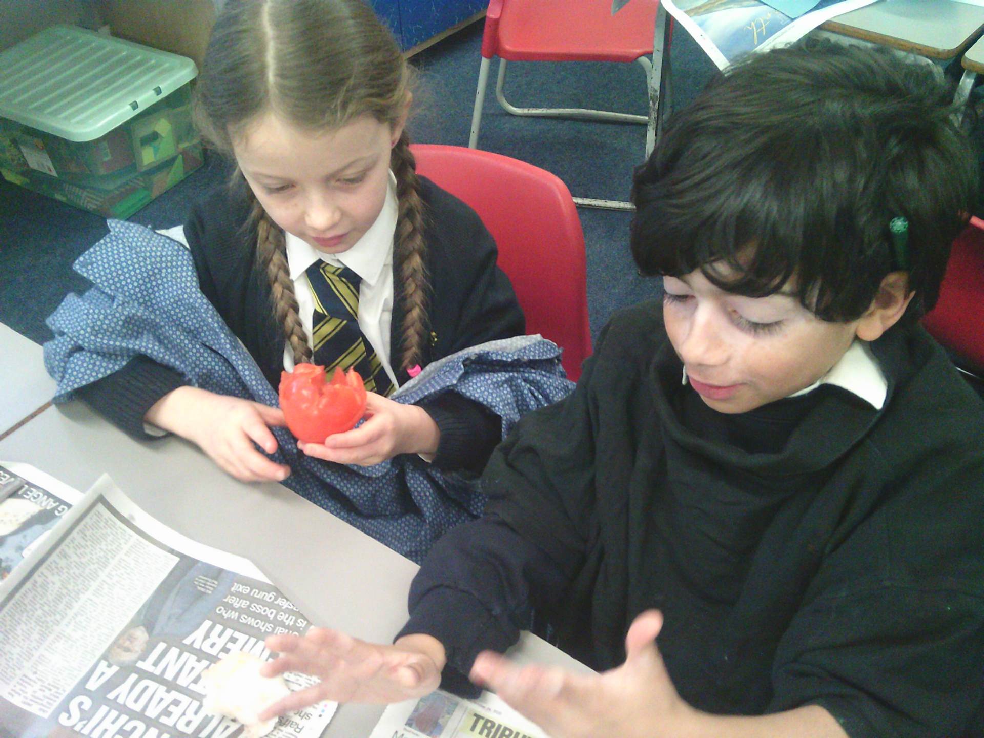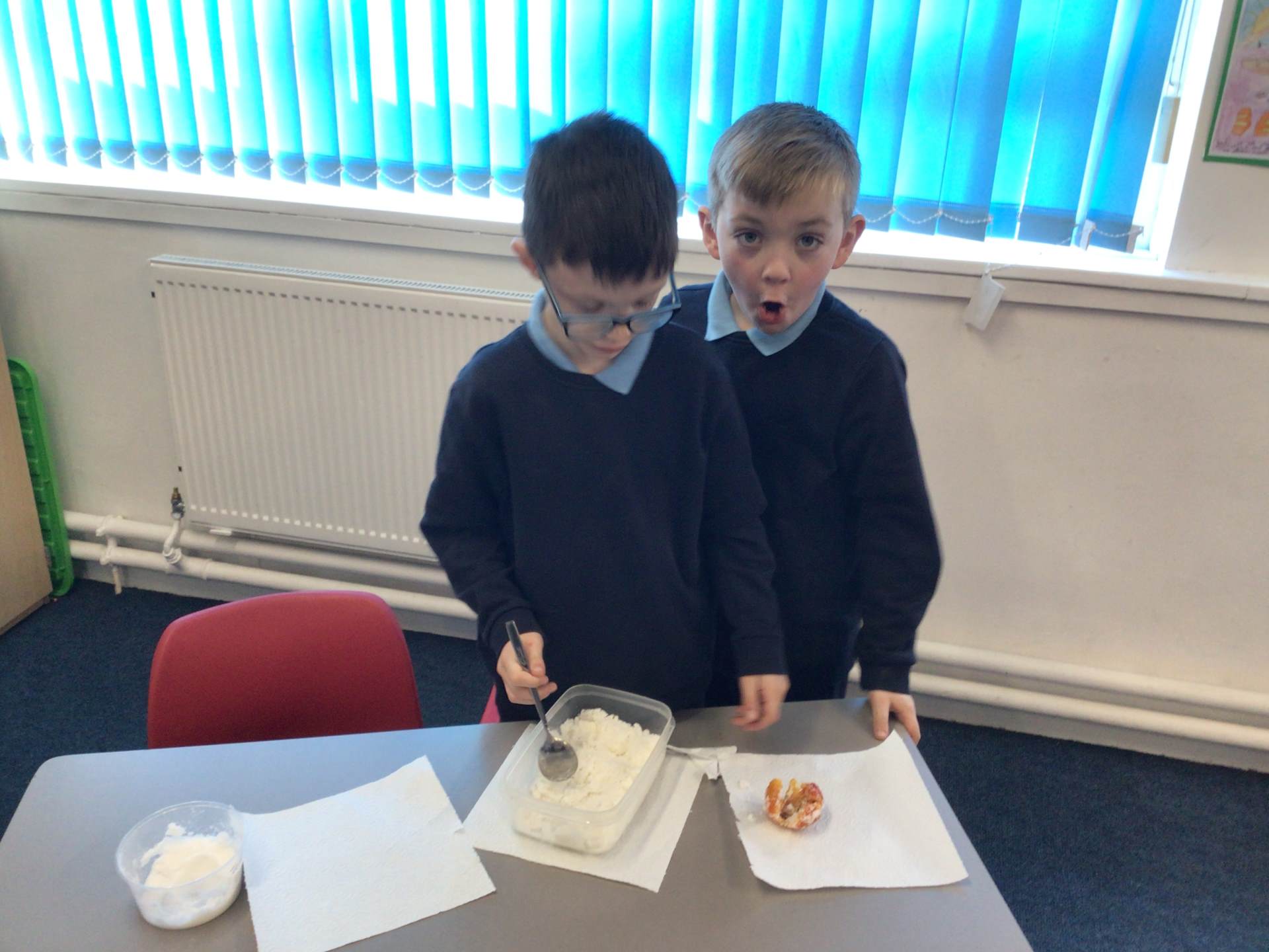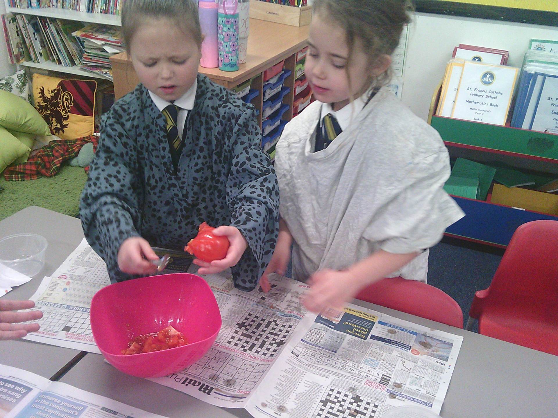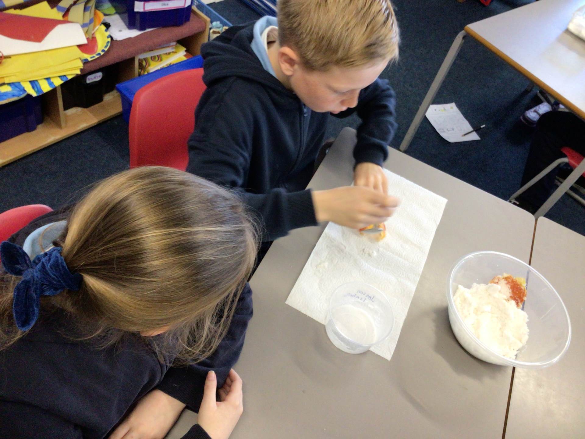 We each had a tomato and we worked together. We covered the tomato in salt and bicarbonate soda. It was really fun and really messy!
