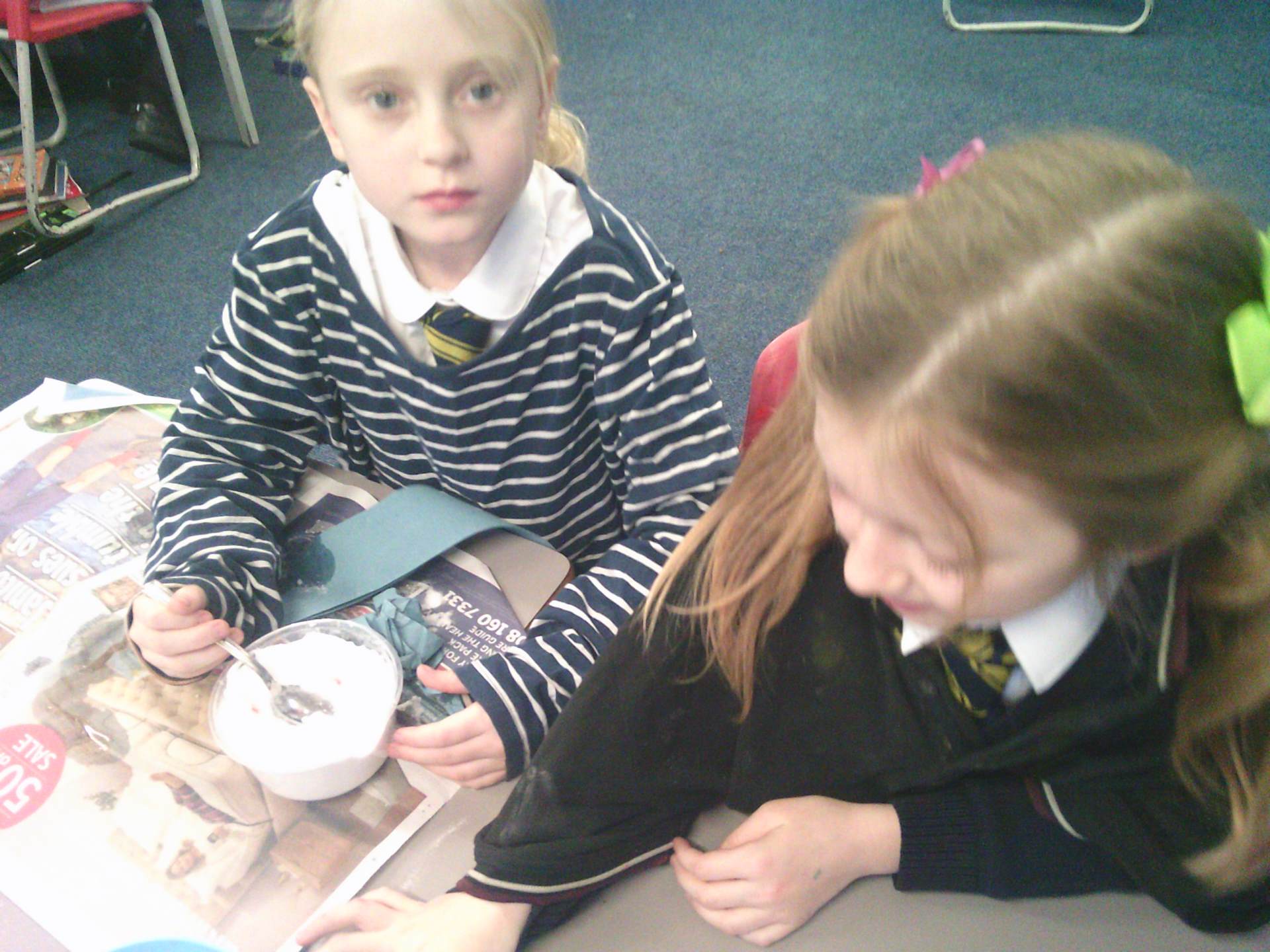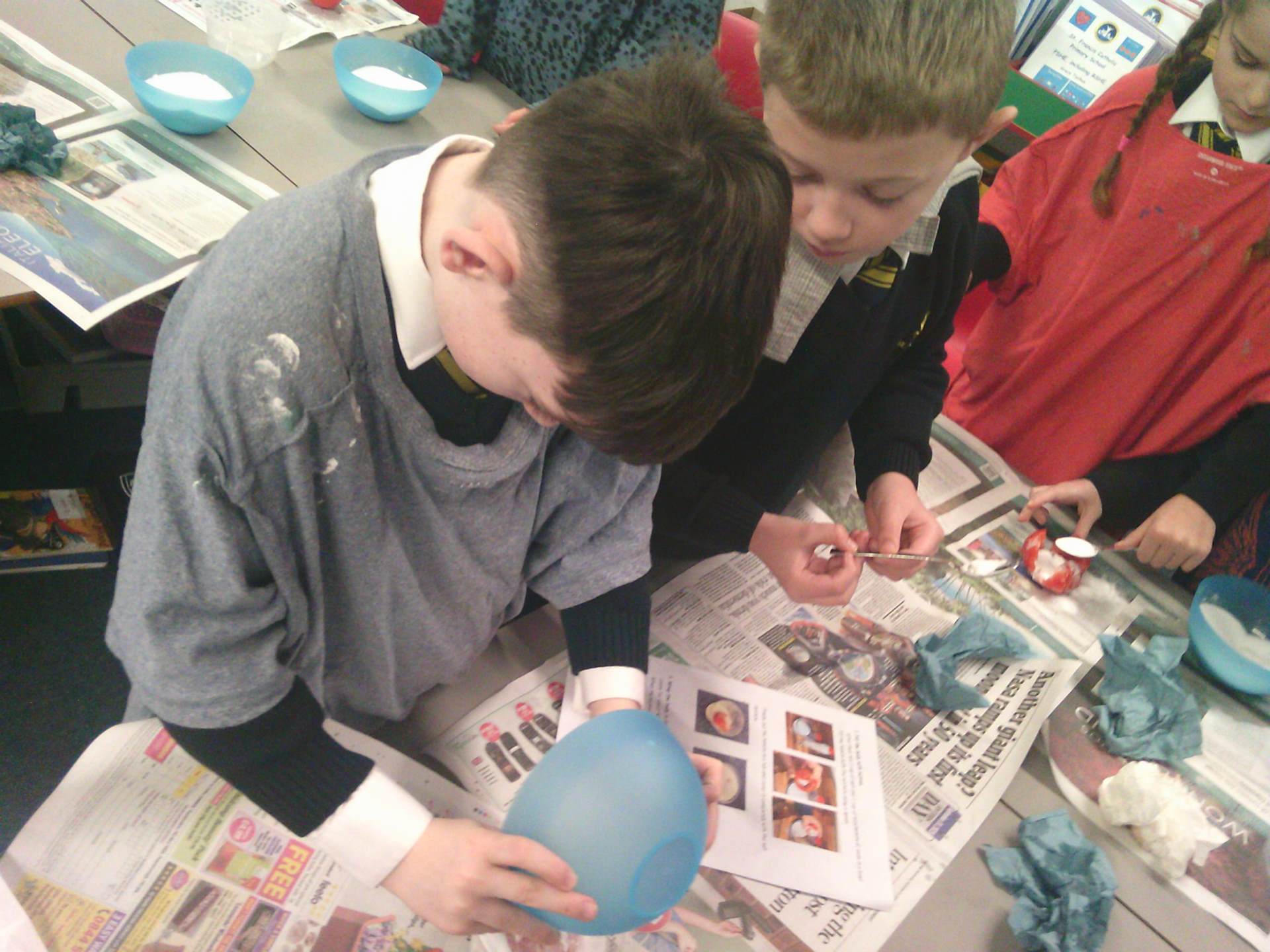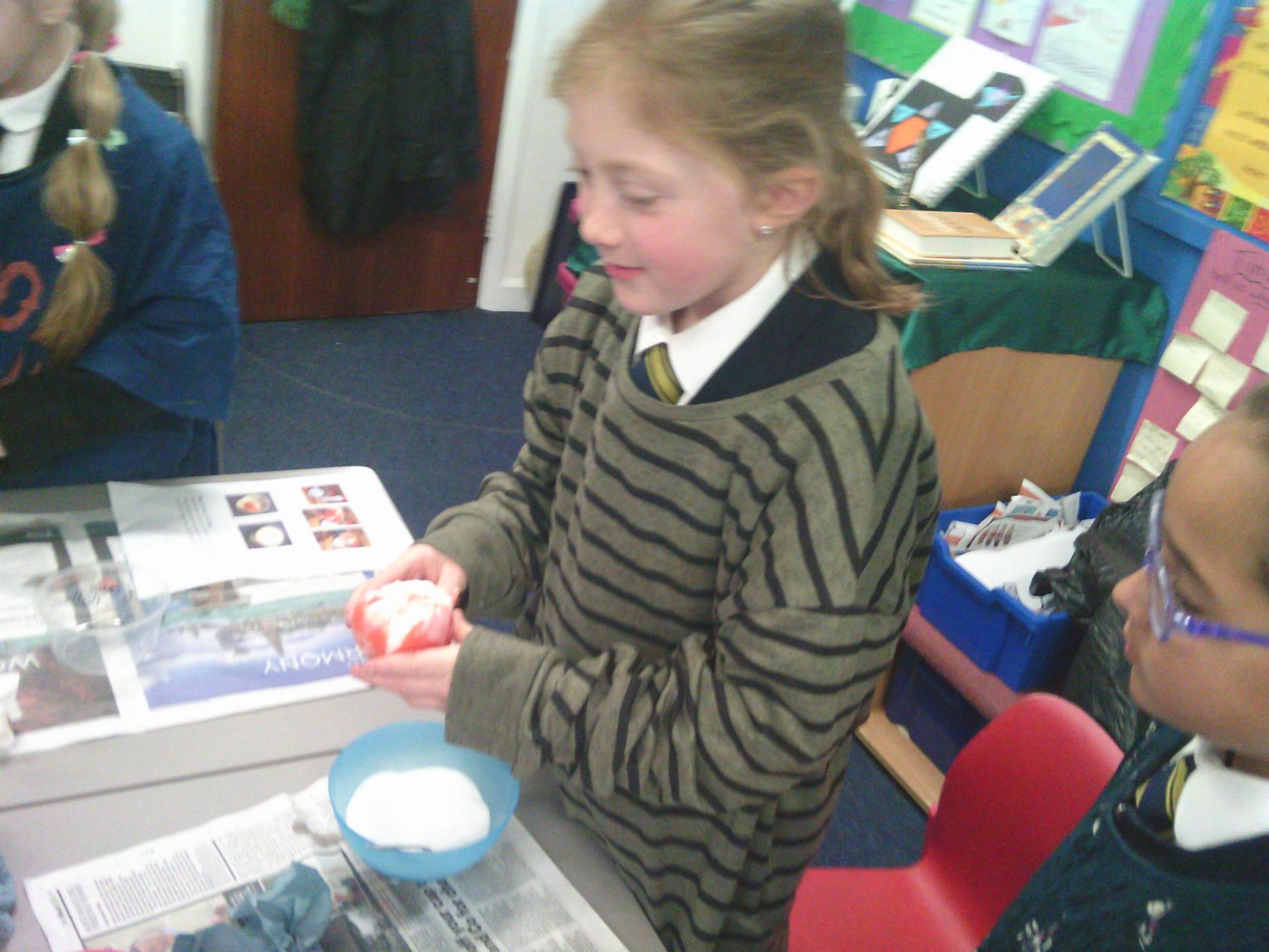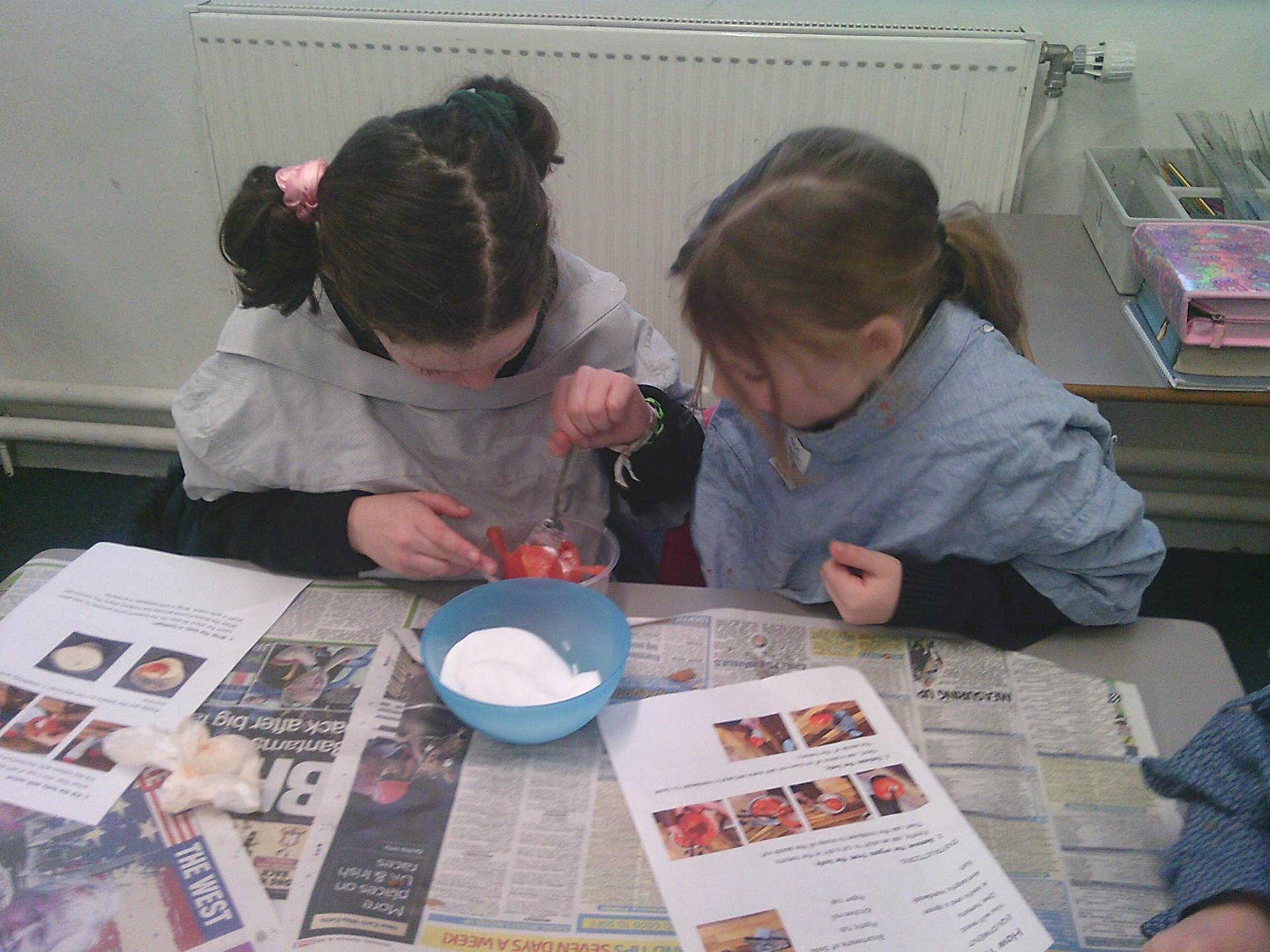 We each had a tomato and we worked together. We covered the tomato in salt and bicarbonate soda. It was really fun and really messy!