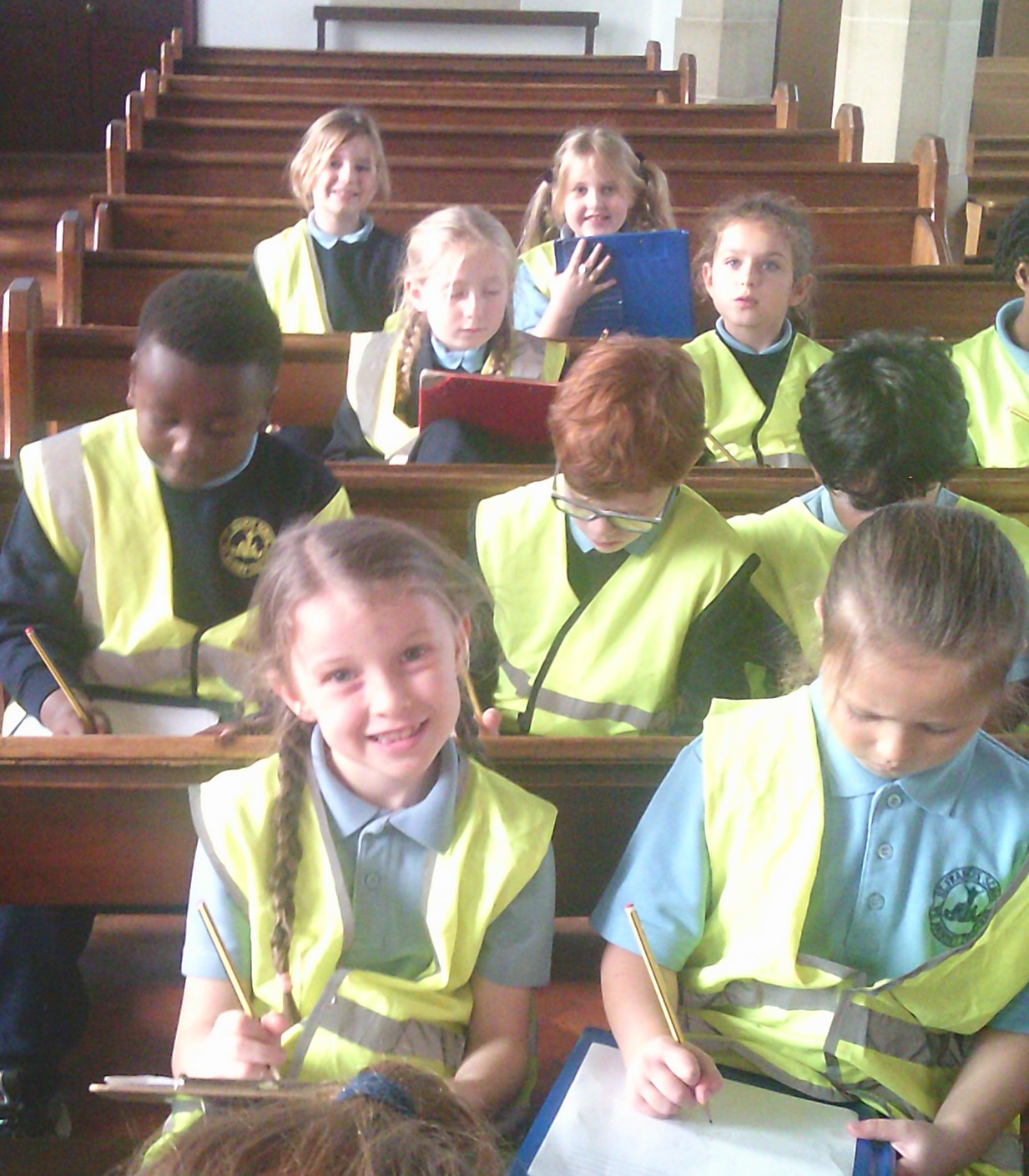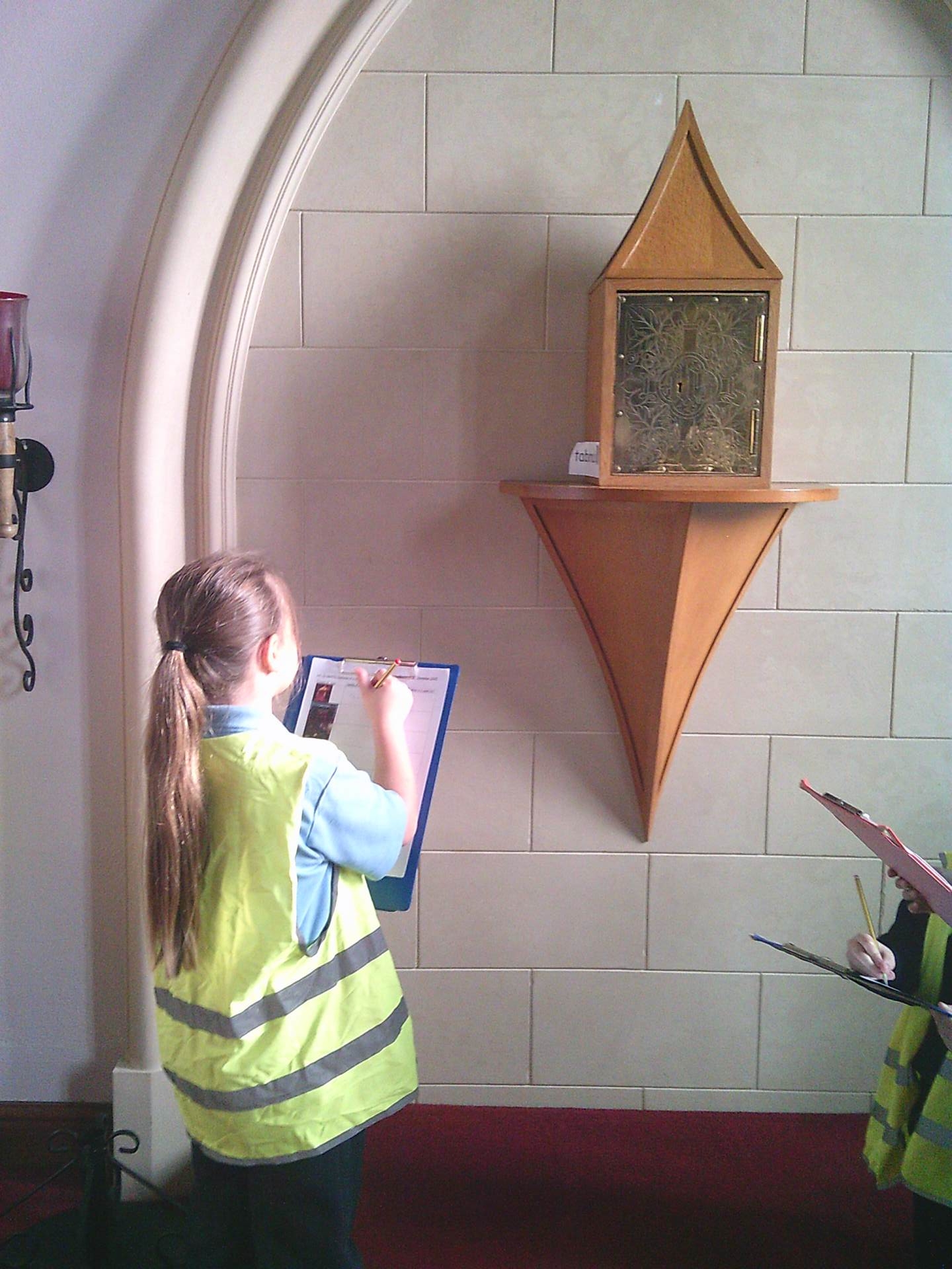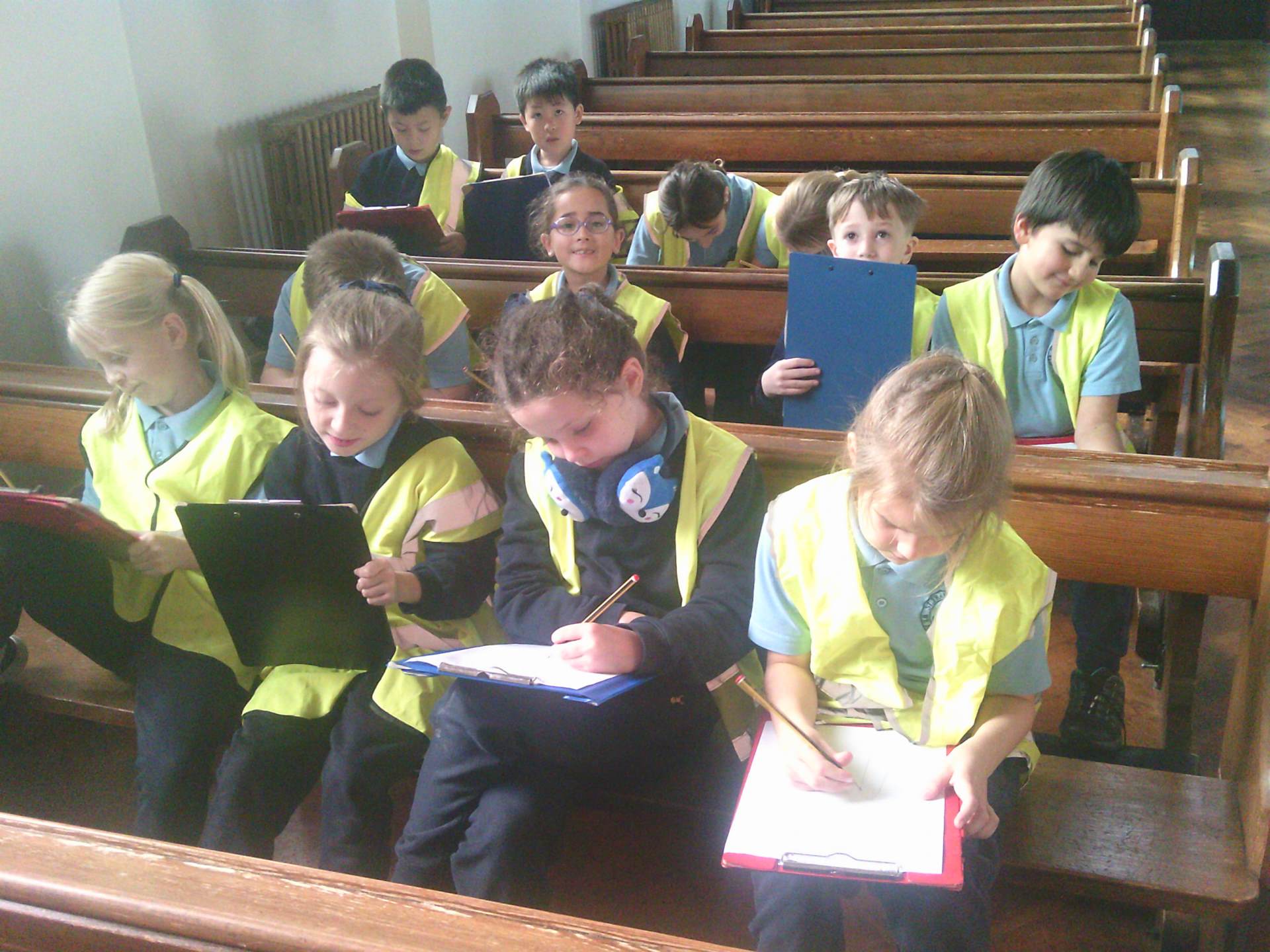 objects we had found out about during our lessons. Seeing the items in real life really helped them to put meaning to their learning. We looked closely at the stained glass windows in the church, noticing the colours used, how they are different from normal windows and the images they depicted. We were really grateful to the parents who helped us on our walk to and from the church!