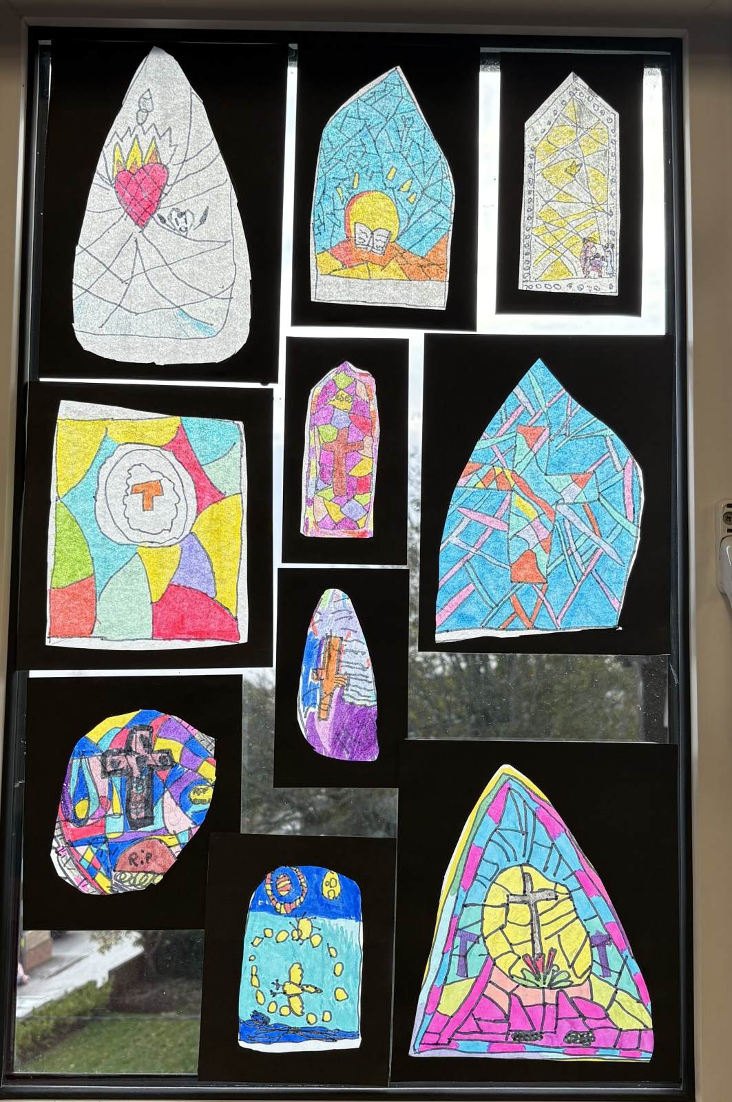 Finally, we used our observations of the stained glass windows to design and create our own. We were so impressed with the creativity shown by the children during this activity. They had full choice over the shape and images shown in their windows and the finished artwork is beautiful. The stained glass windows are now being proudly displayed in our classroom.