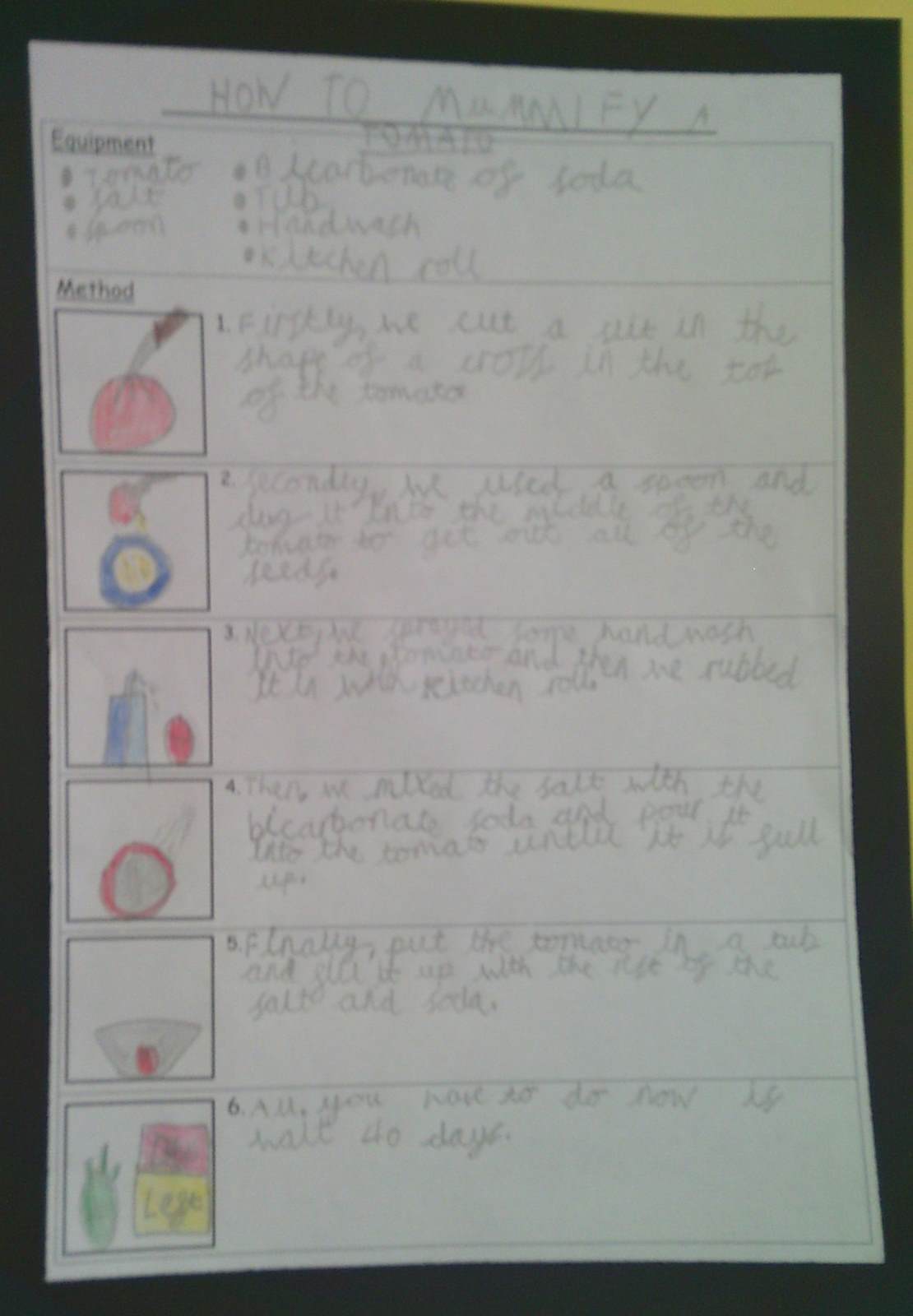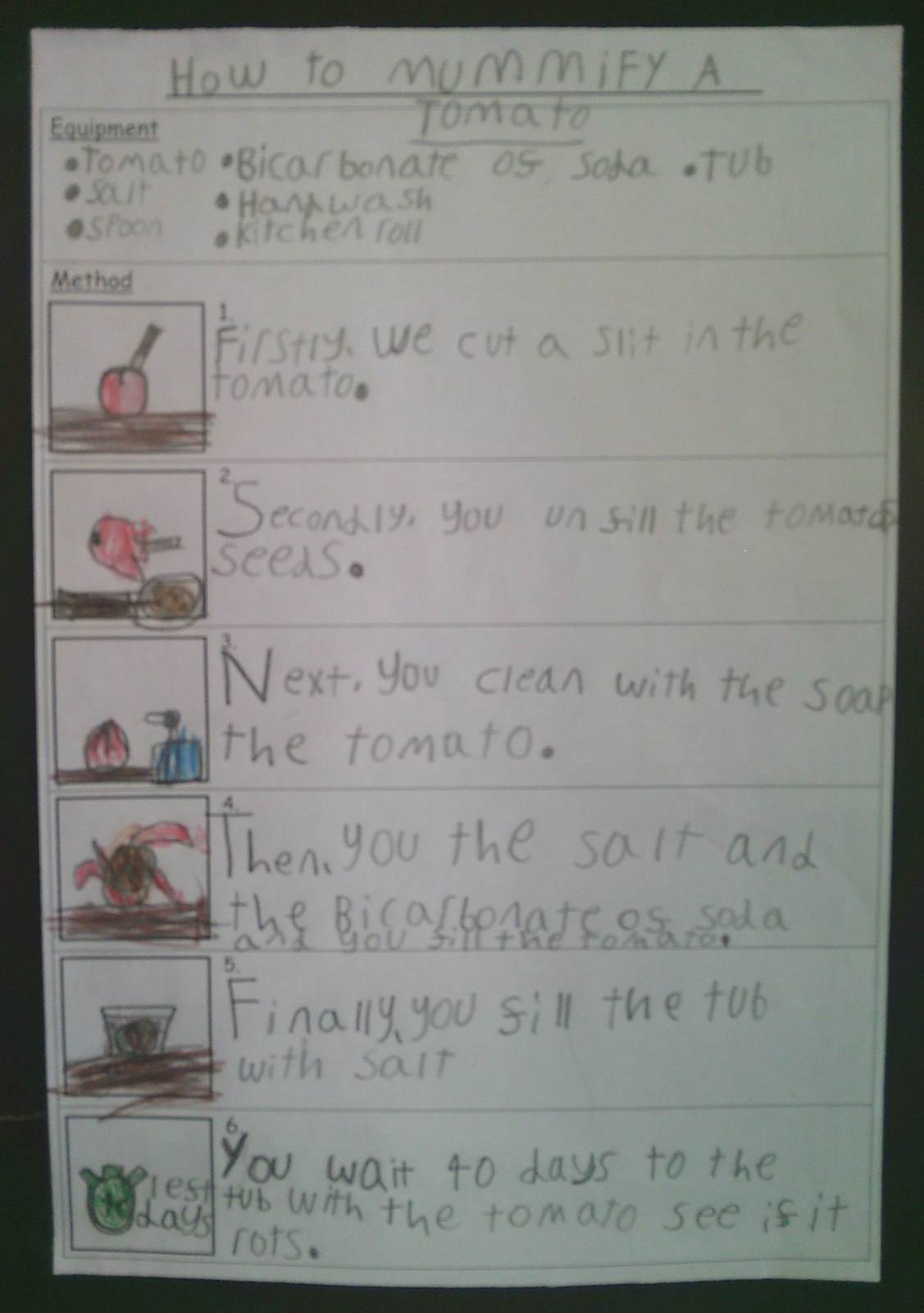 In English, the children built on this experience by writing clear, step-by-step instructions explaining how to mummify a tomato. They focused on using imperative verbs, time connectives and precise vocabulary to ensure their instructions were easy to follow. The lesson allowed pupils to deepen their understanding through hands-on learning while making meaningful links across subjects.