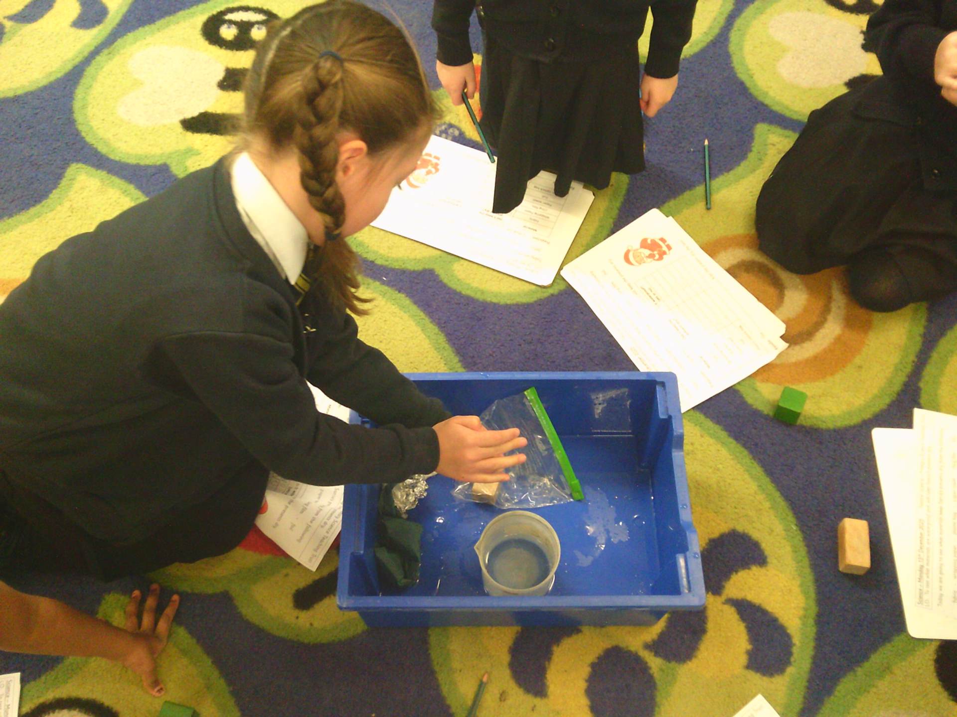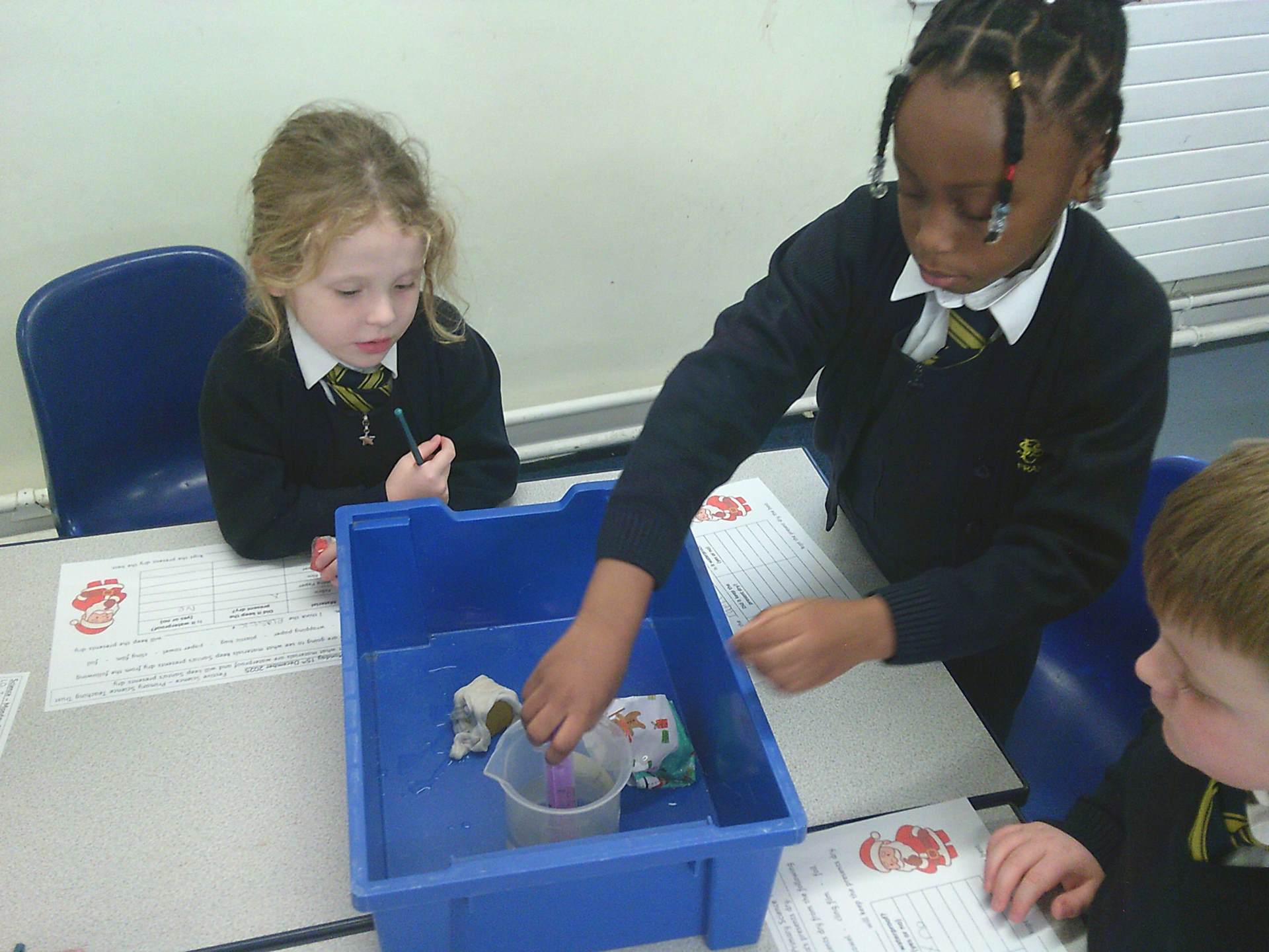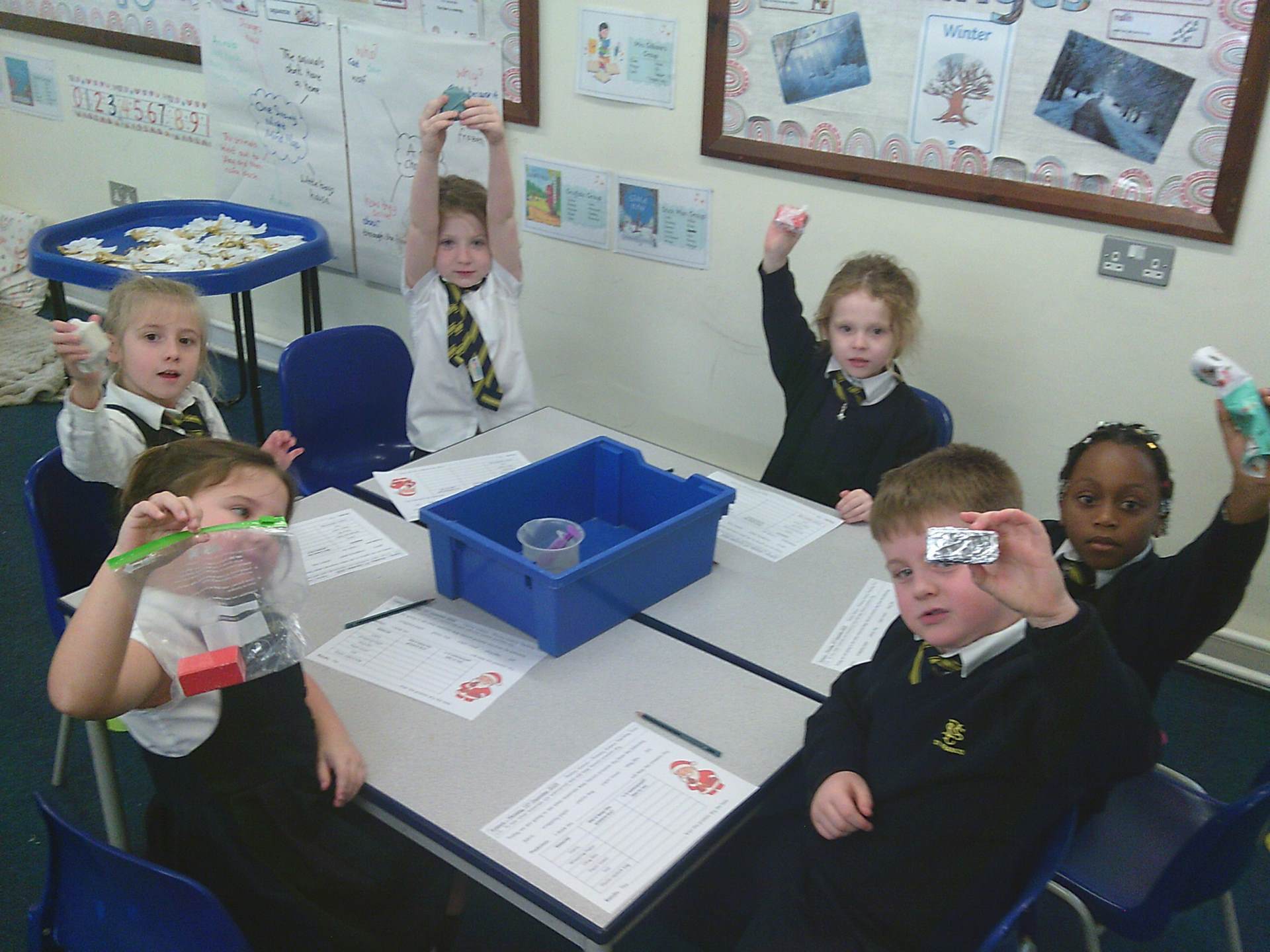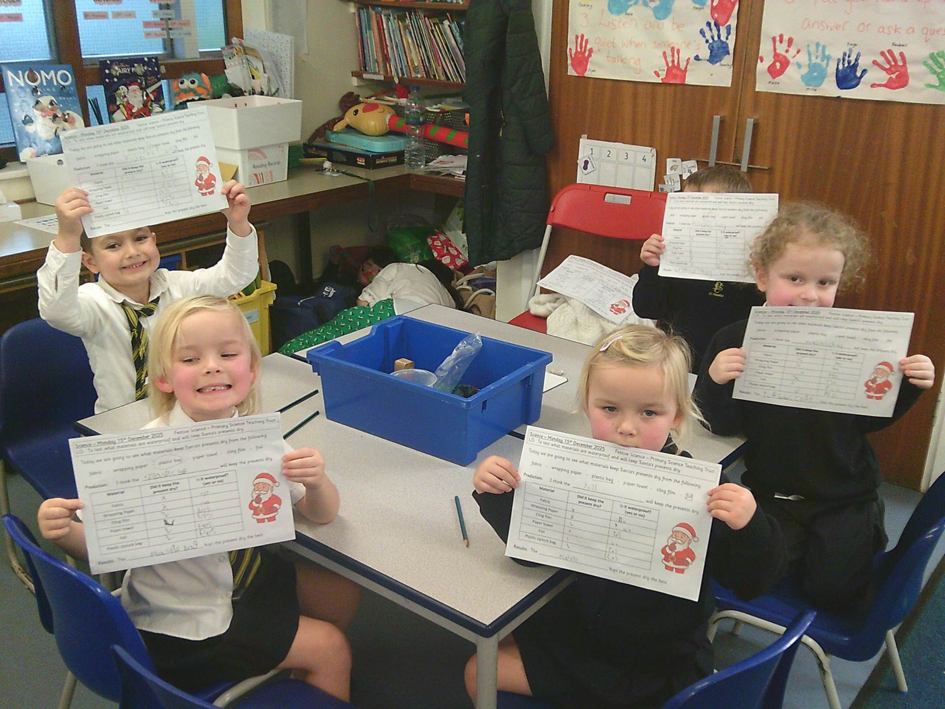 One challenge focused on discovering which materials would keep Santa’s presents dry. Children tested a variety of materials, observing which absorbed water and which were waterproof. In the Star Challenge, children created stars using different materials and placed them onto water to see which star opened first, learning how materials react differently when wet.