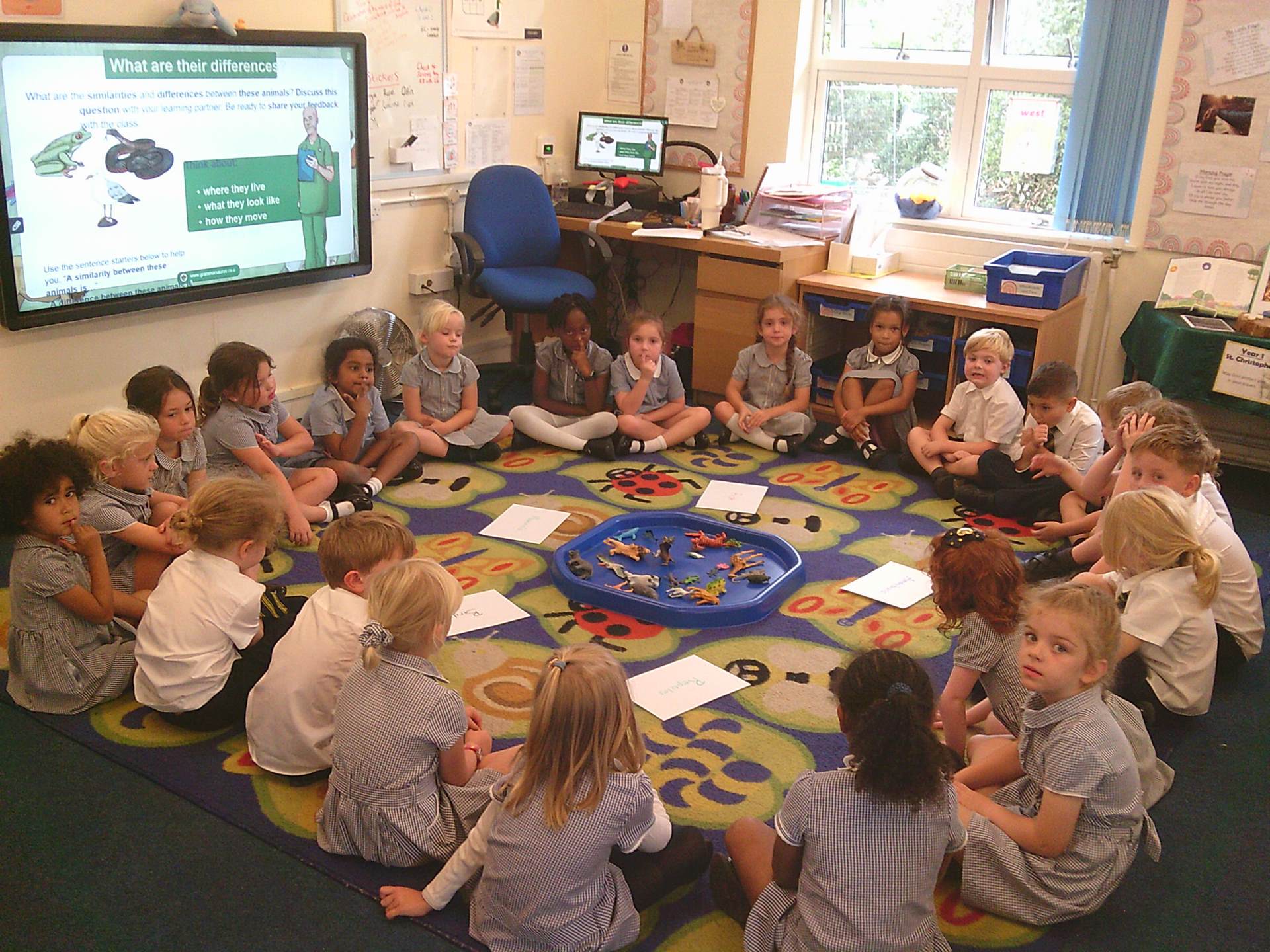 This half term in Science the children have been learning about different animal classifications. Children know there are 5 groupings of animals – mammals, reptiles, fish, birds and amphibians and can confidently name an animal that belongs to each group. This was demonstrated during a practical activity where the children sat in a circle with a range of animals and they each had a turn of putting an animal into the correct classification.