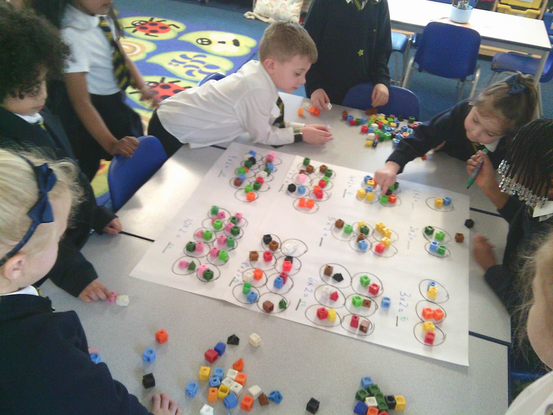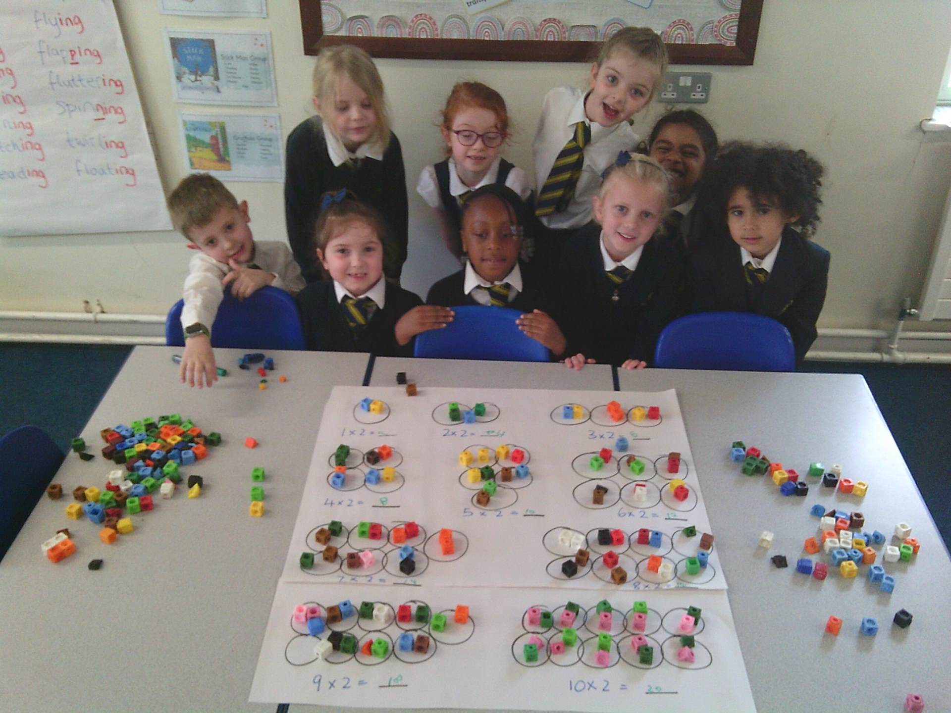 our two times tables. We have used different methods including choral chanting of 1x2 = 2, 2x2 =4 etc… and creating doubling bridging fingers as a mirror image with our partners to help the children visually see how multiplying by 2 is just having 2 of the same number. The children enjoyed a small group practical activity of grouping cubes into twos again to visually represent the multiplication with some children challenging themselves to go past 10x2 to make both 11x2 and 12x2 independently.