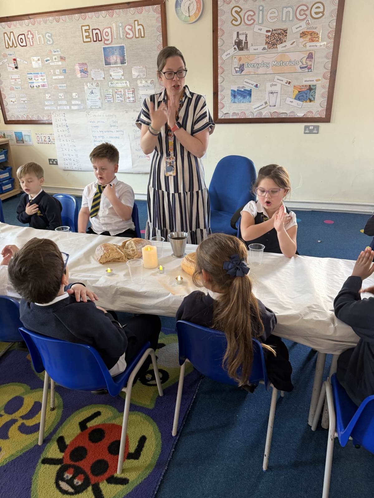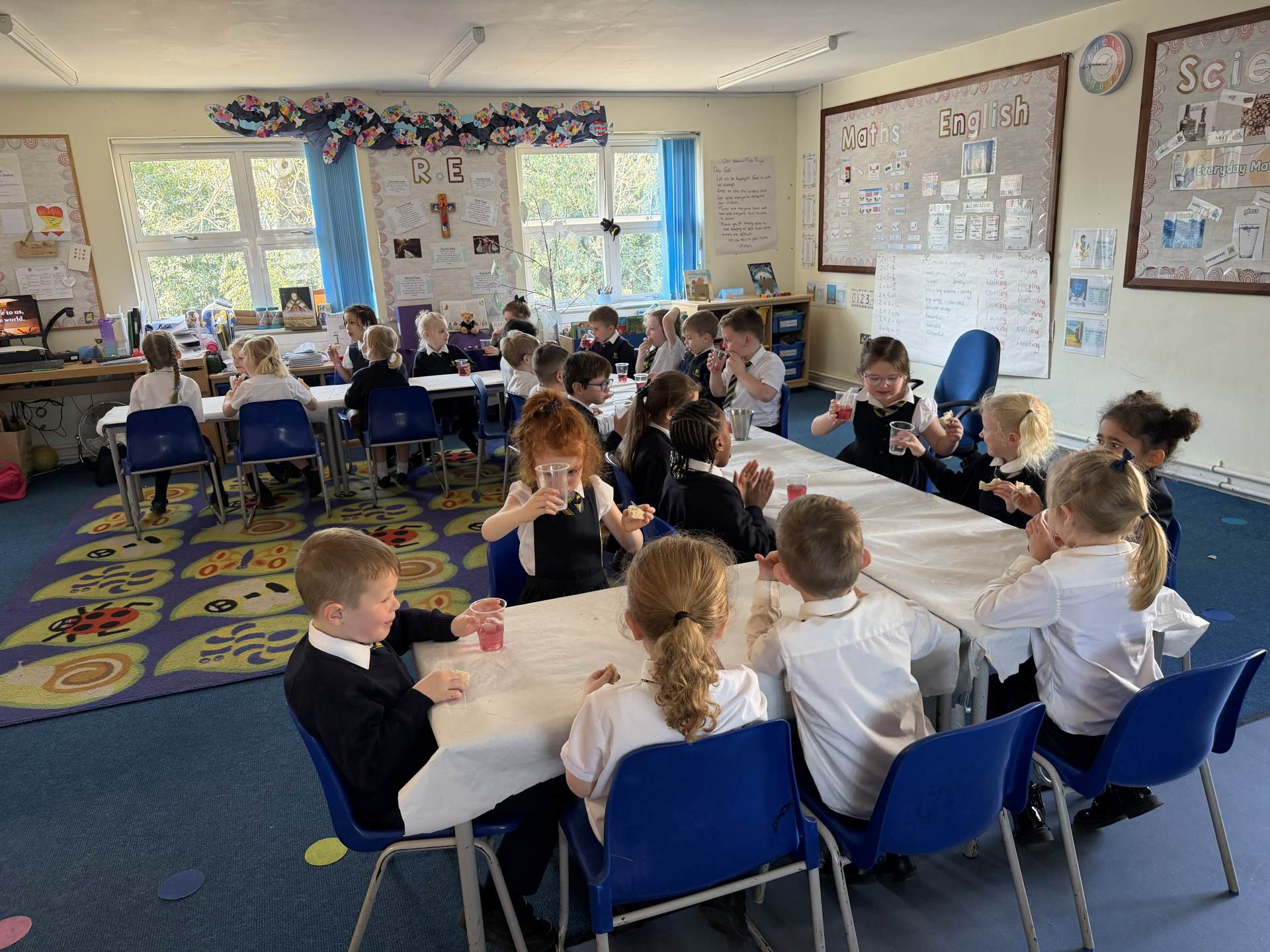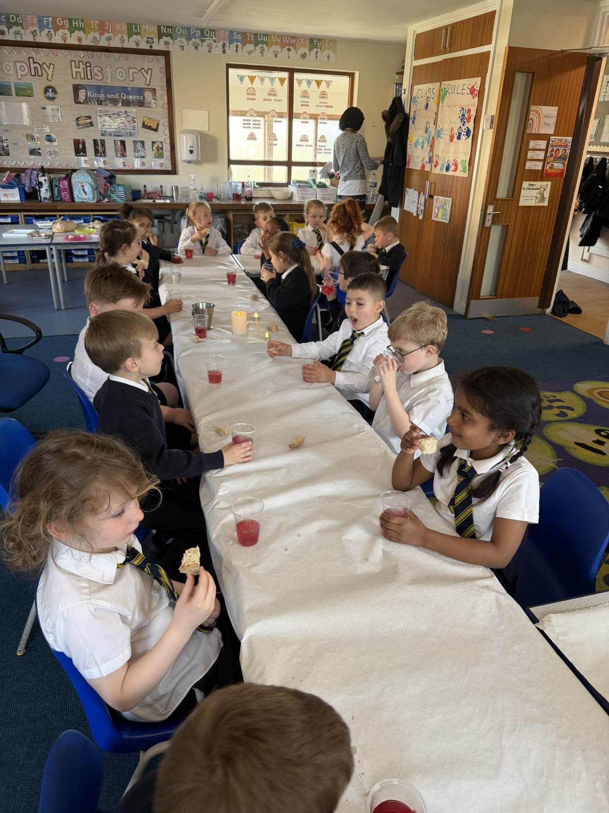We have explored all about Lent this half term in our R.E lessons starting with Ash Wednesday then moving through to Holy Week including Palm Sunday, the Last Super and the crucifixion of Jesus. To support our input and worksheets the children have re-enacted Jesus riding into Jerusalem on a donkey where they laid down their robes (coats) and palm leaves as he entered. The children were given a “wow”moment when the Year 1 classroom was transformed into the Last Supper. We all became disciples of Jesus and shared both bread and blackcurrant squash to represent the body and blood of Jesus as to recreate this pivotal moment in the lead up to Easter.